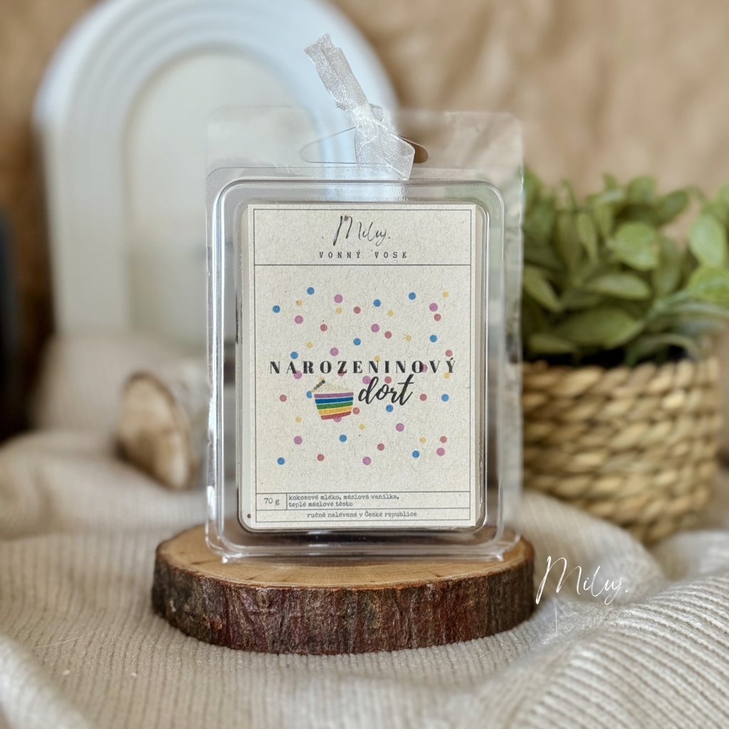 Vonný vosk do aromalampy s teplou vůní těsta, másla, kokosového mléka a vanilkového krému. Bílý máslový dort s barevným cukrářským sypáním.