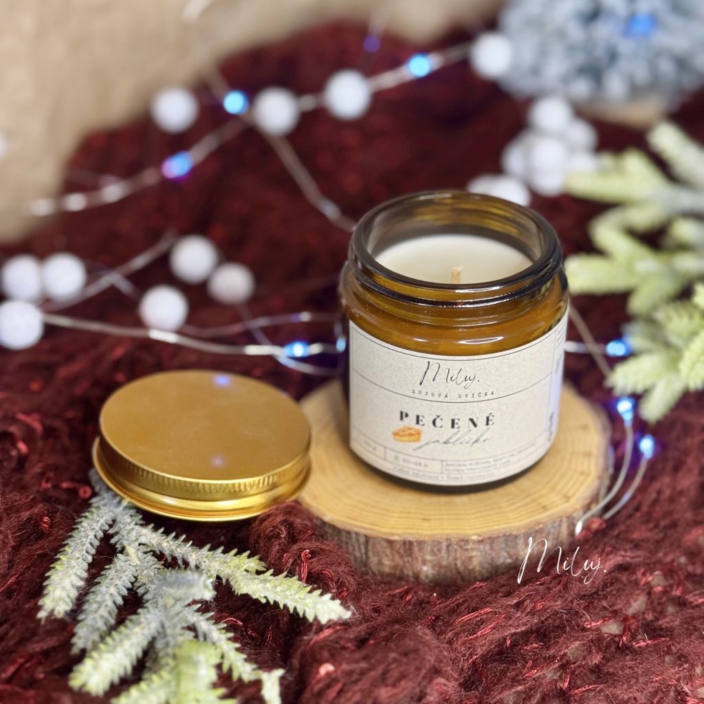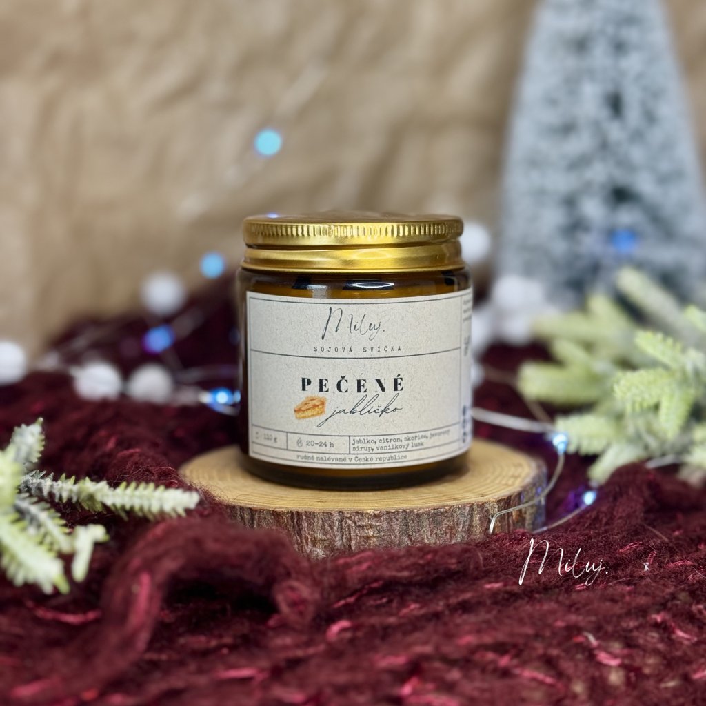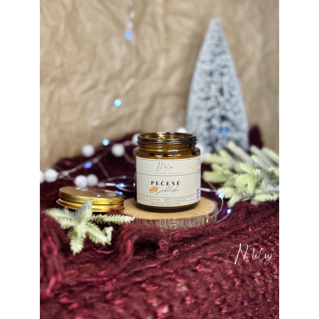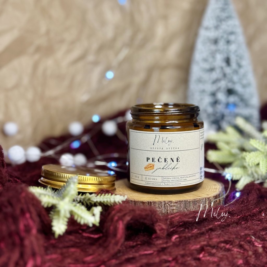 Sójová svíčka s vůní sladkého pečeného jablíčka politého javorovým sirupem se špetkou skořice. Spolu s jemnými tóny citronu a vanilkového lusku.