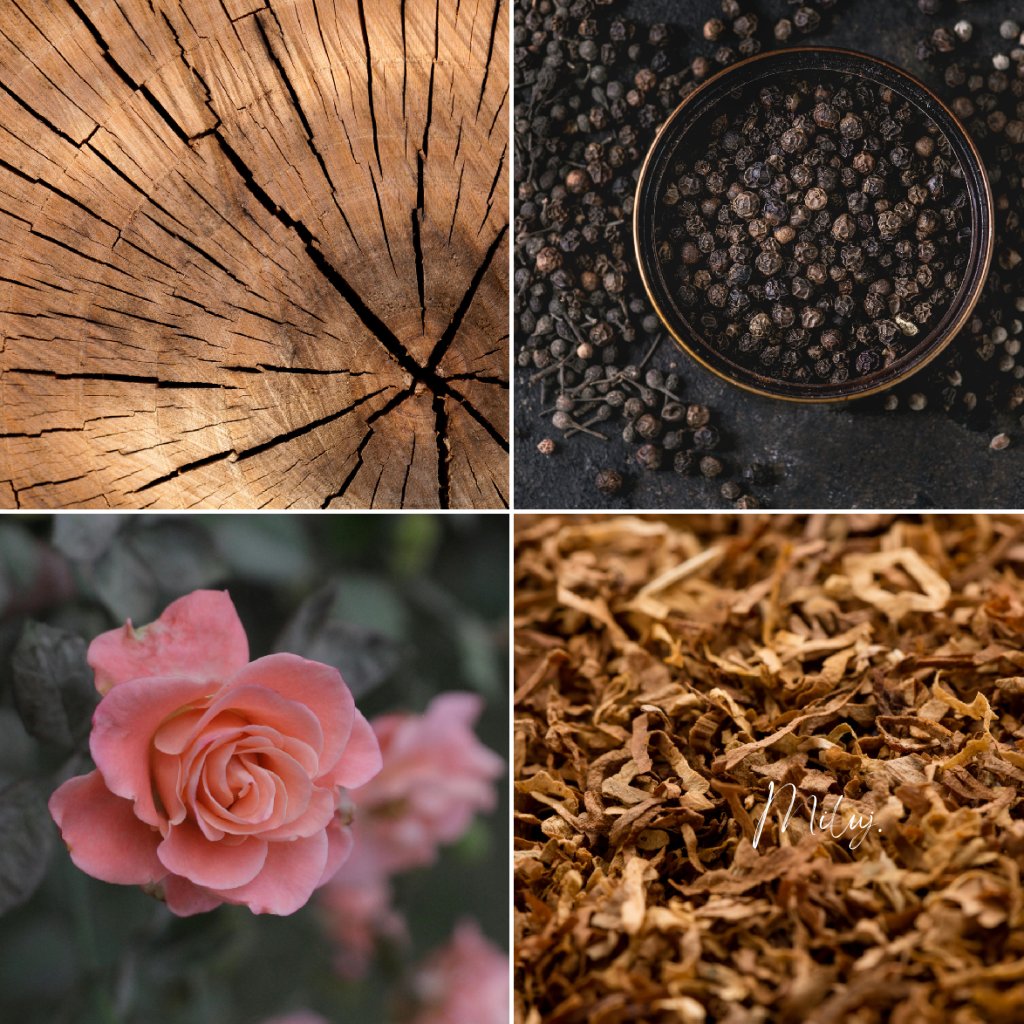 dřevo · pepř · hřebíček · růže · cedr · ambra · pačuli · tabák