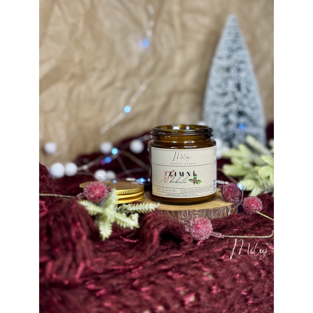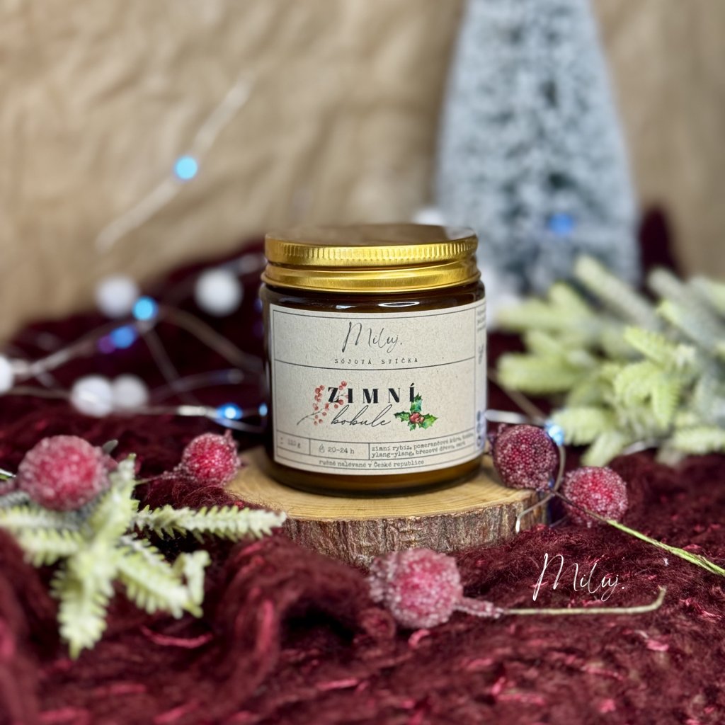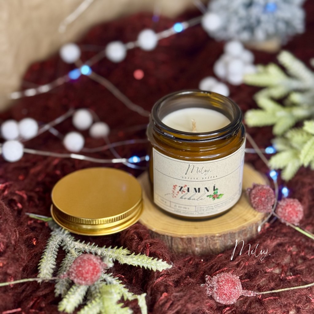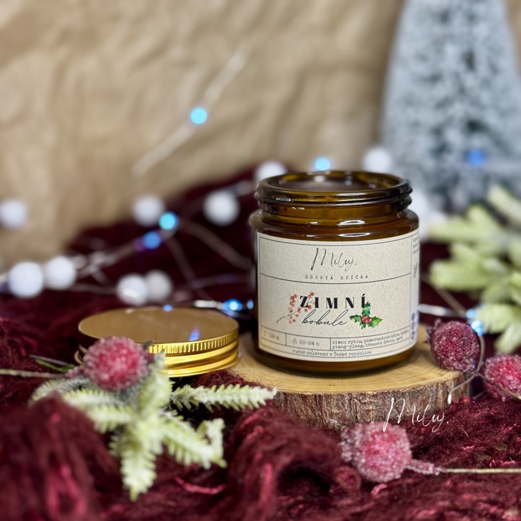 Sójová svíčka s vůní zimního rybízu, pomerančové kůry, březového dřeva a smrku. Sladká vánoční vůně s nádechem smrkového stromečku.